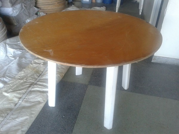 MESA DE PLÁSTICO REDONDA COM TAMPO DE MADEIRA E TOALHAS E COBRE MANCHAS
